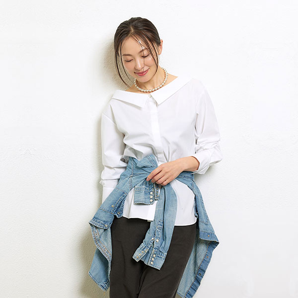 トラッドなシャツを女性らしく、デコルテが綺麗に見えるようオフショルダーに仕上げた一枚。