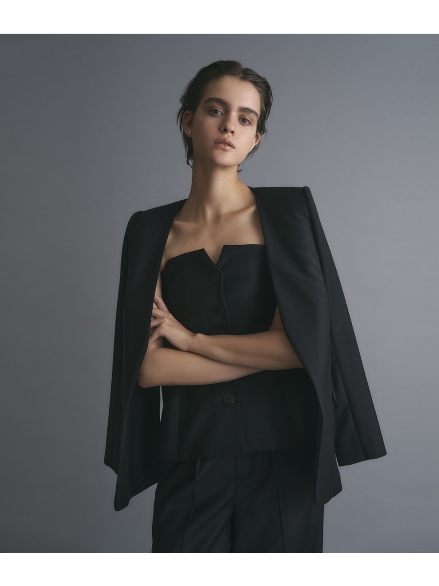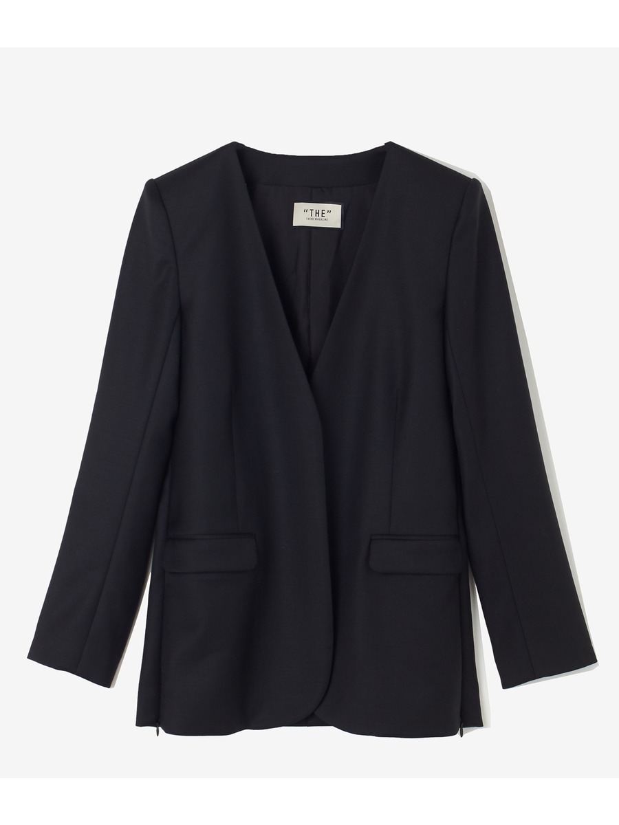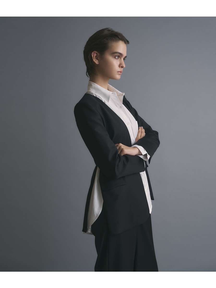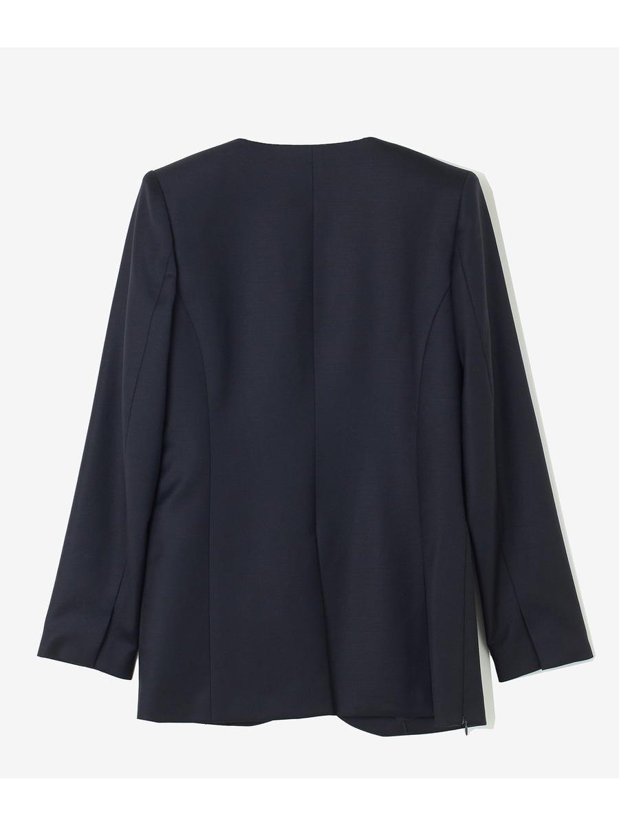 薄めの肩パット付きでノーカラー・ノーボタンながらかっちり感のあるシルエット。