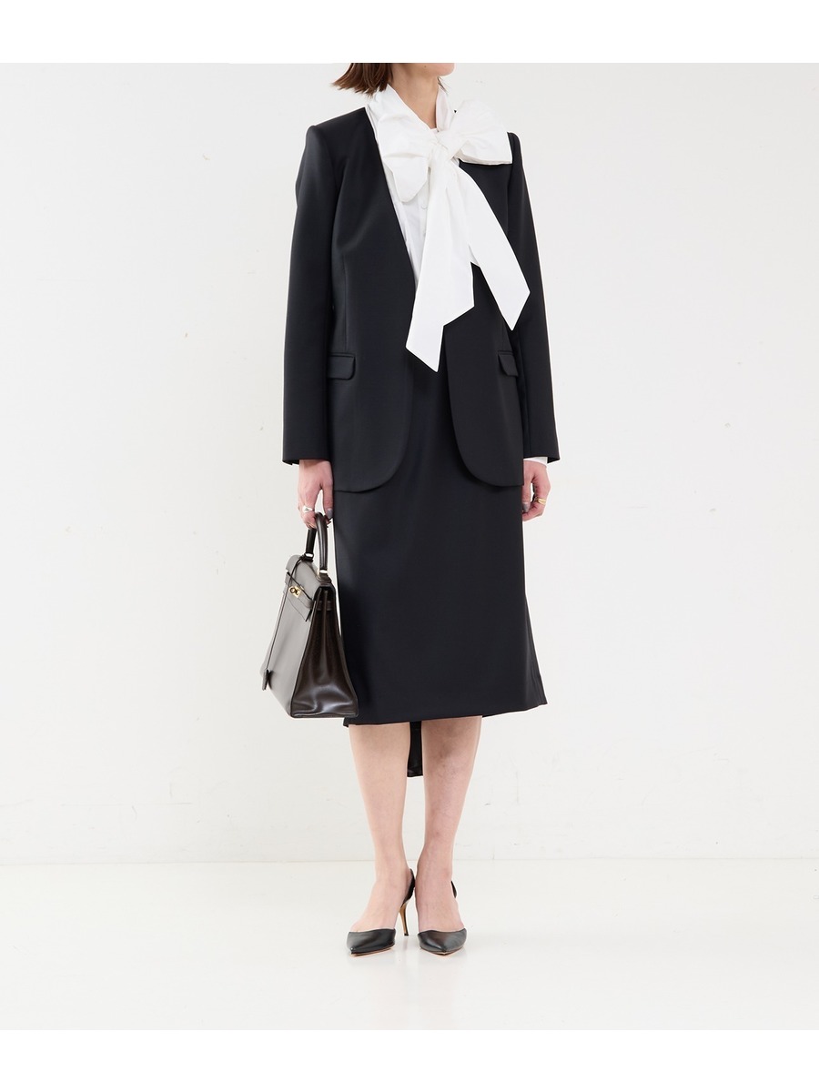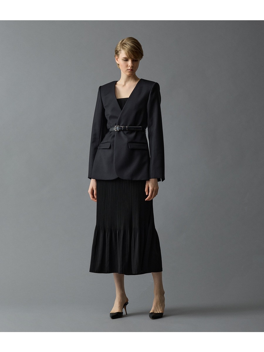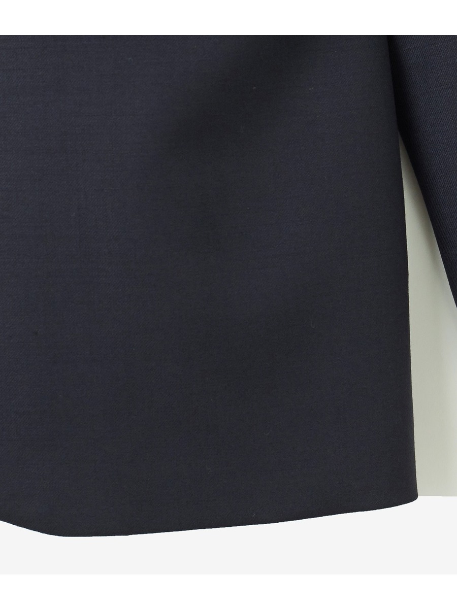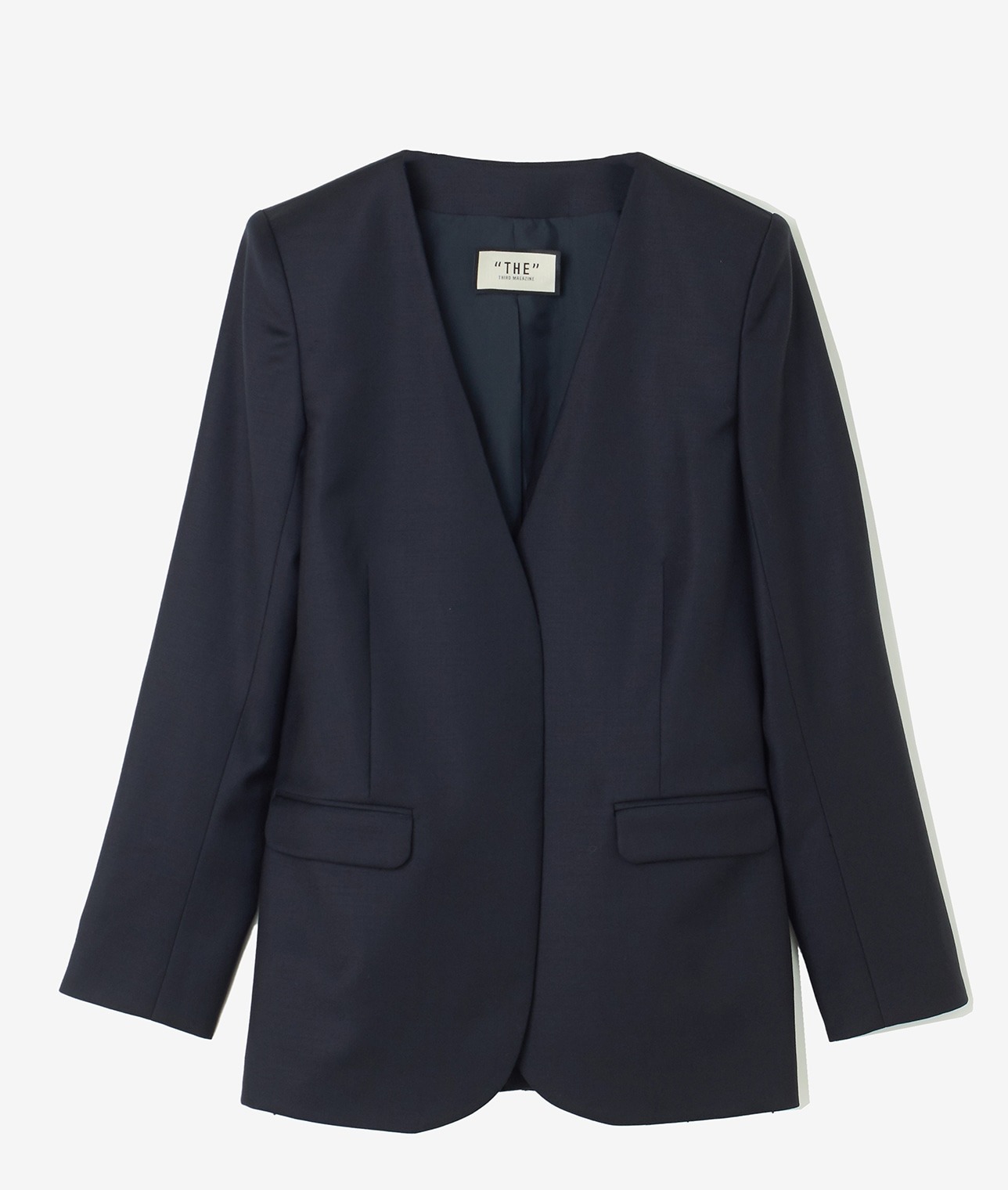 薄めの肩パット付きでノーカラー・ノーボタンながらかっちり感のあるシルエット。