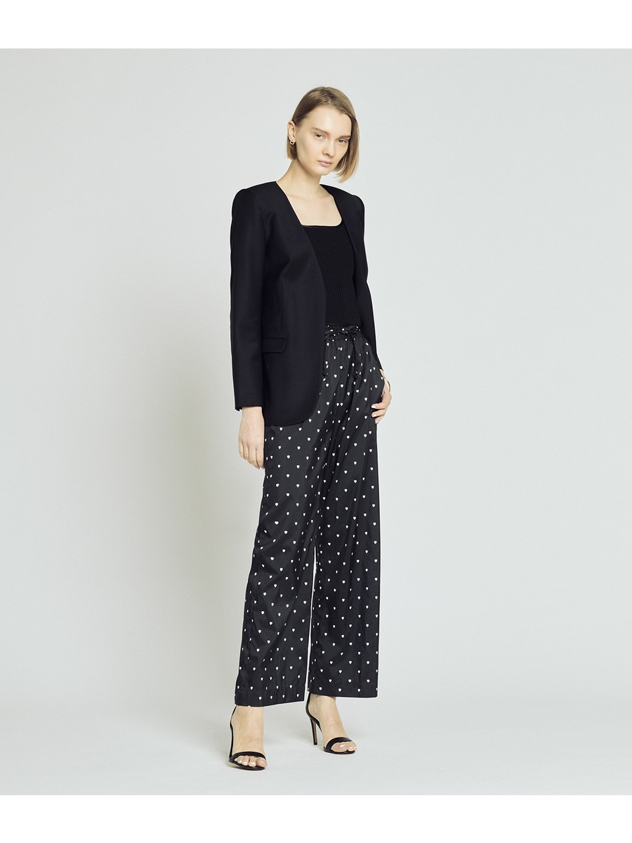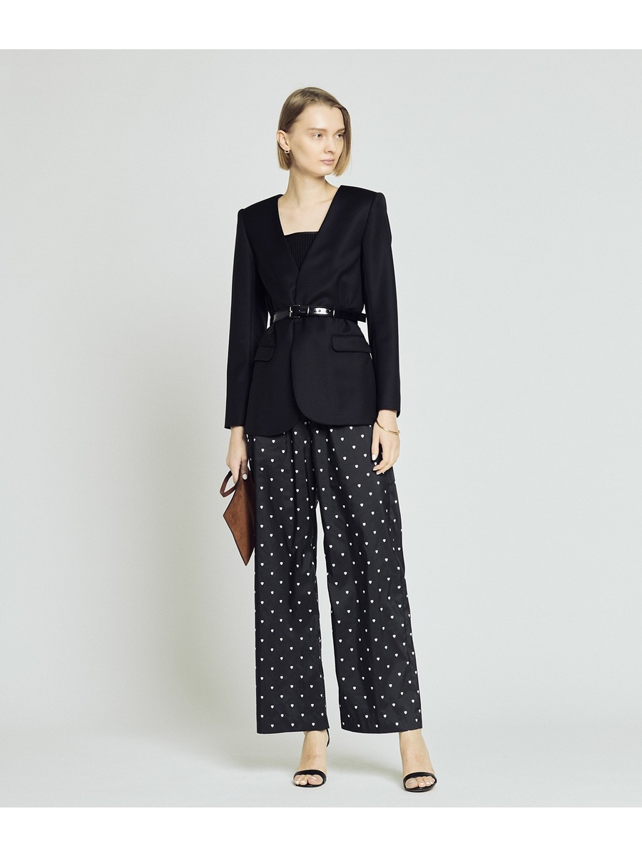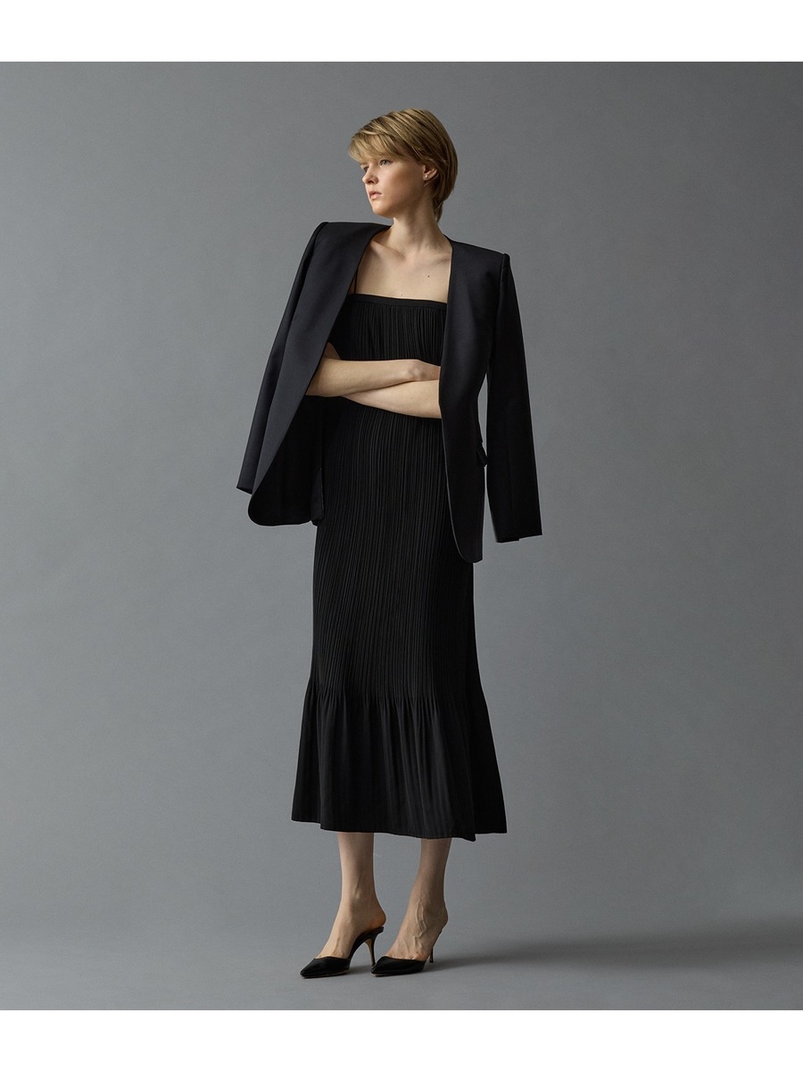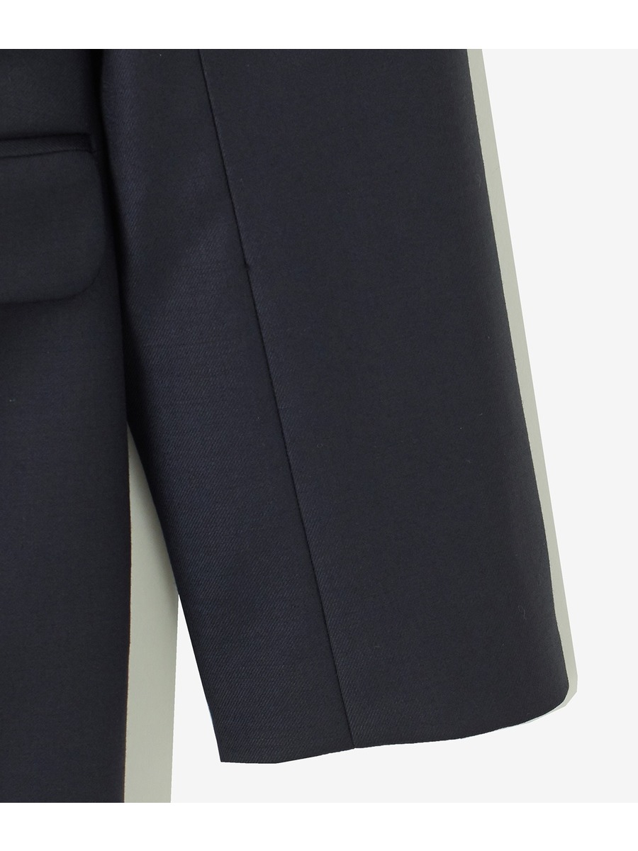 薄めの肩パット付きでノーカラー・ノーボタンながらかっちり感のあるシルエット。
