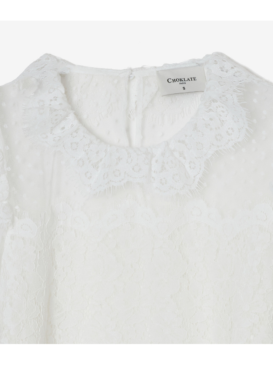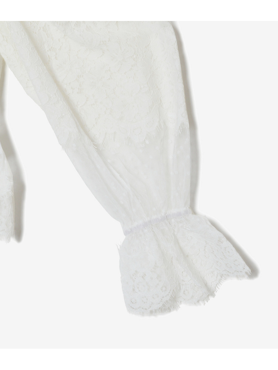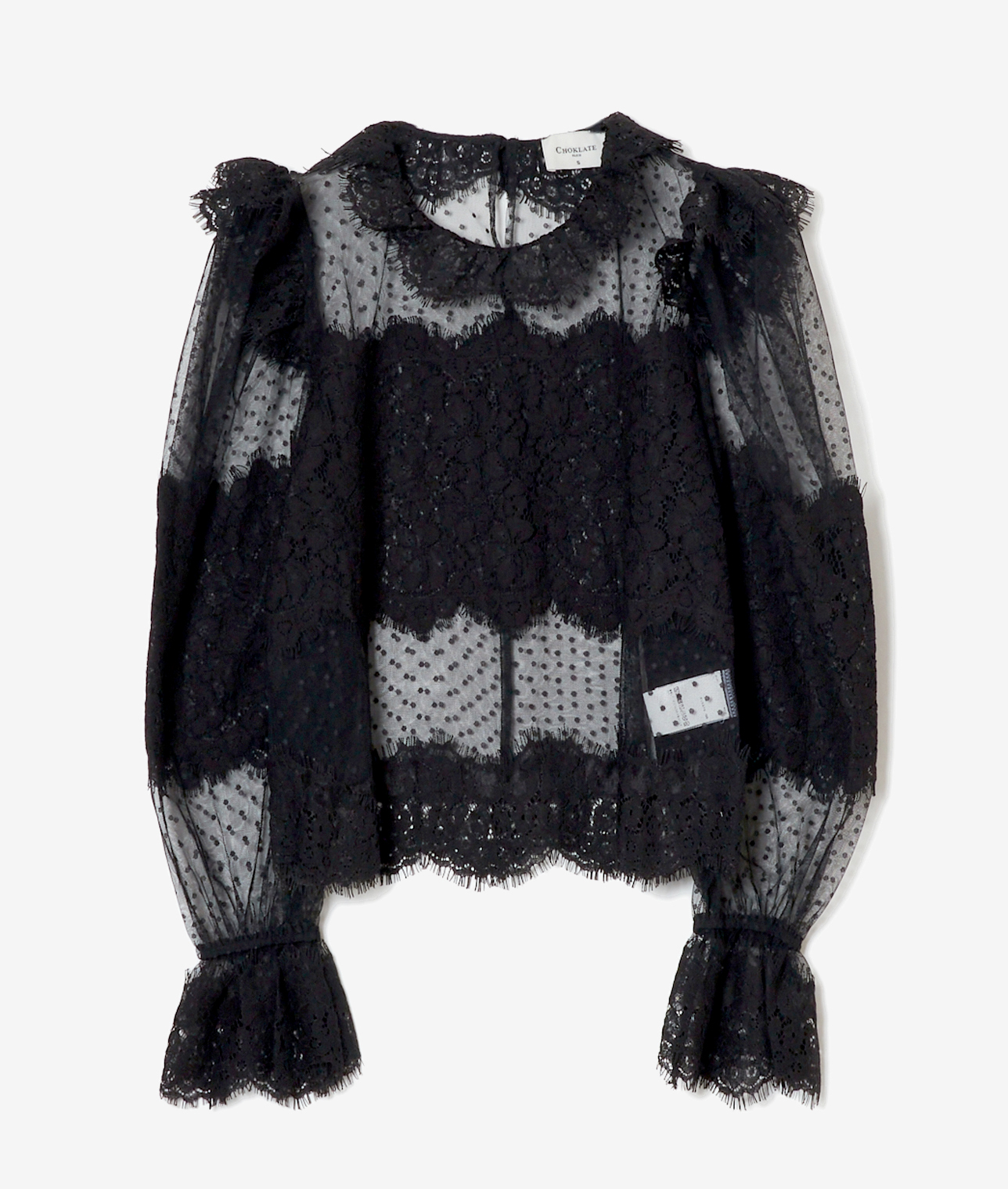 柄の異なるレースを切り替えて仕立てたプルオーバーブラウス。